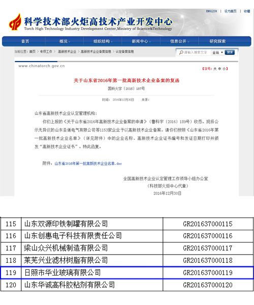 根據全國高新技術企業認定管理工作領導小組辦公室《關于山東省2016年第一批高新技術企業備案的復函》,我公司被認定為“國家級高新技術企業”。